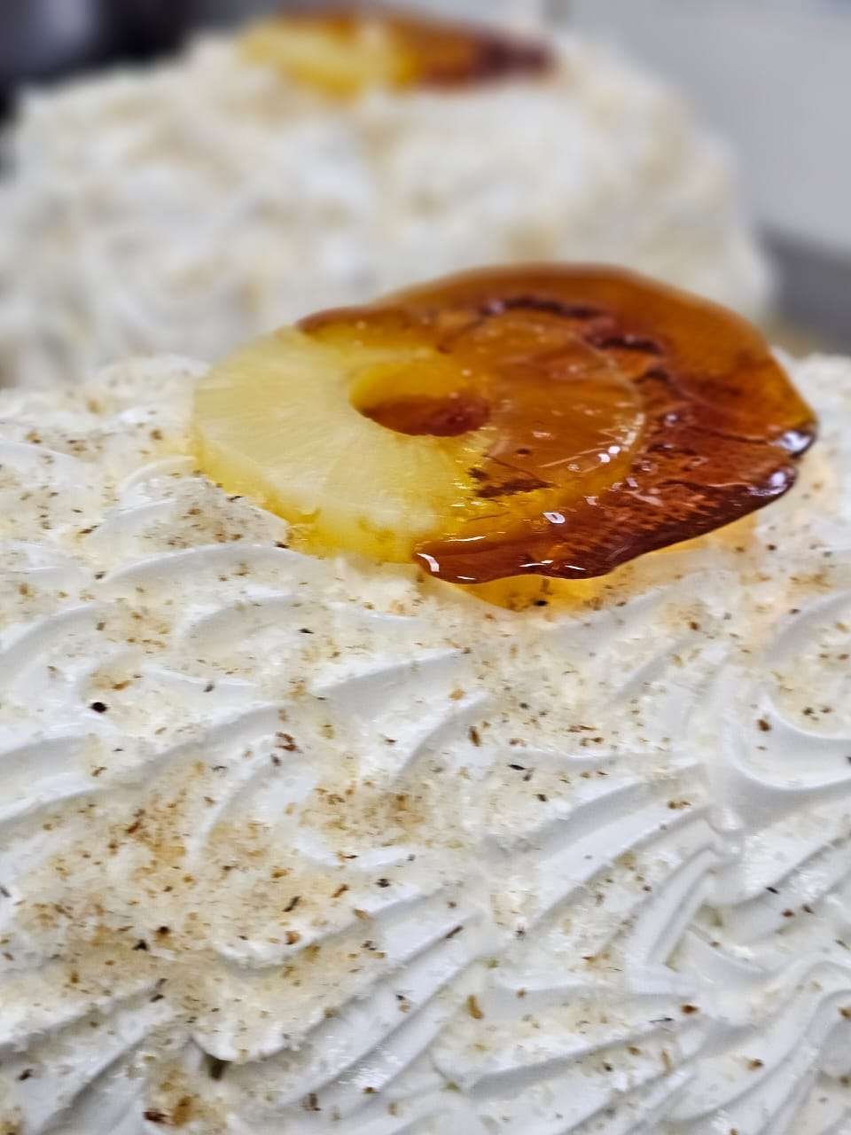 Rollo de bizcochuelo tradicional relleno con una suave y delicada crema con piña. Cubierto en merengue.