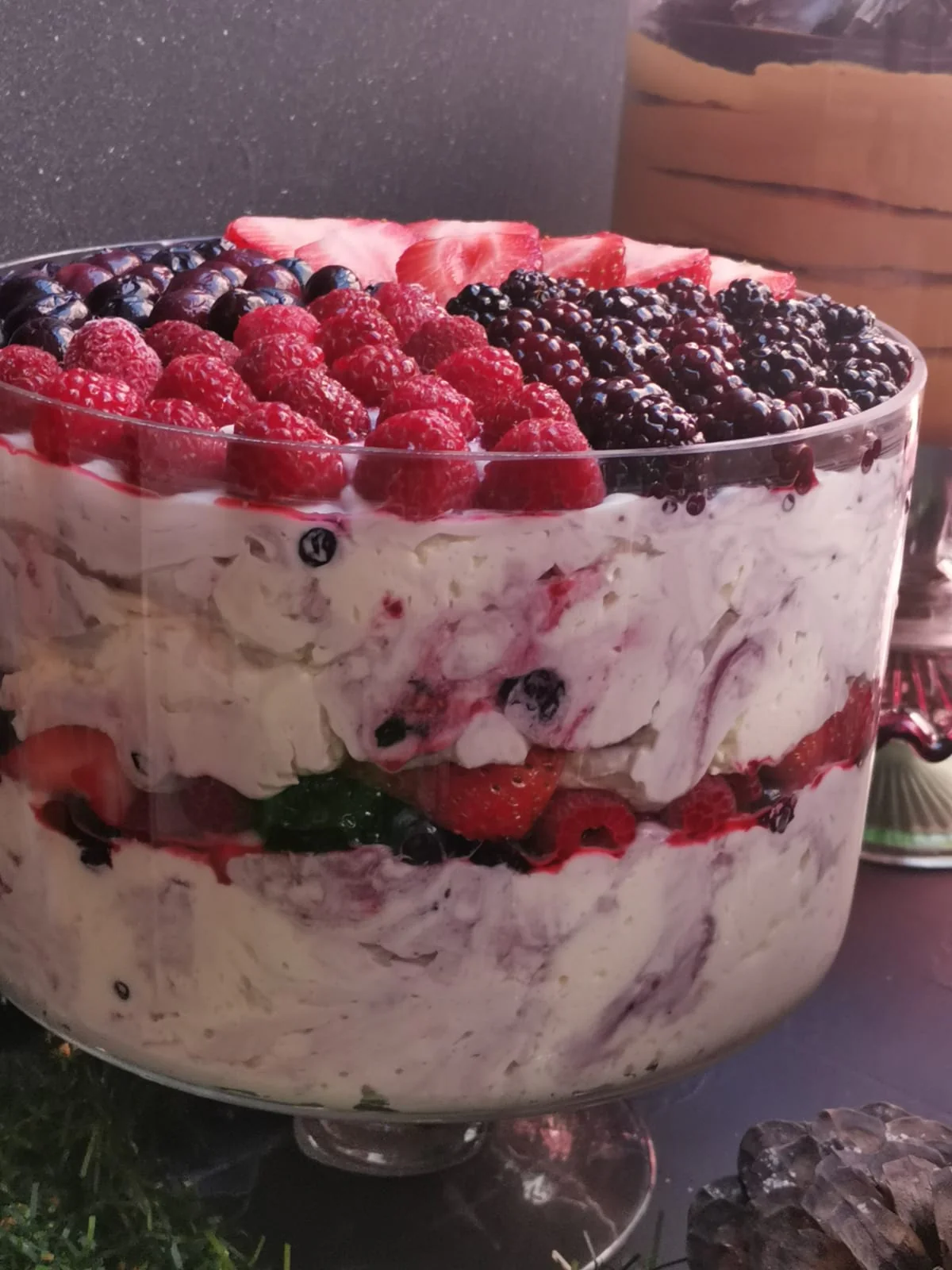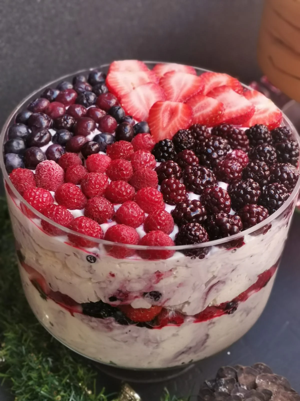Postre en copa a base de Mousse de berries (frutillas, frambuesas, moras y arándanos) con fruta natural.