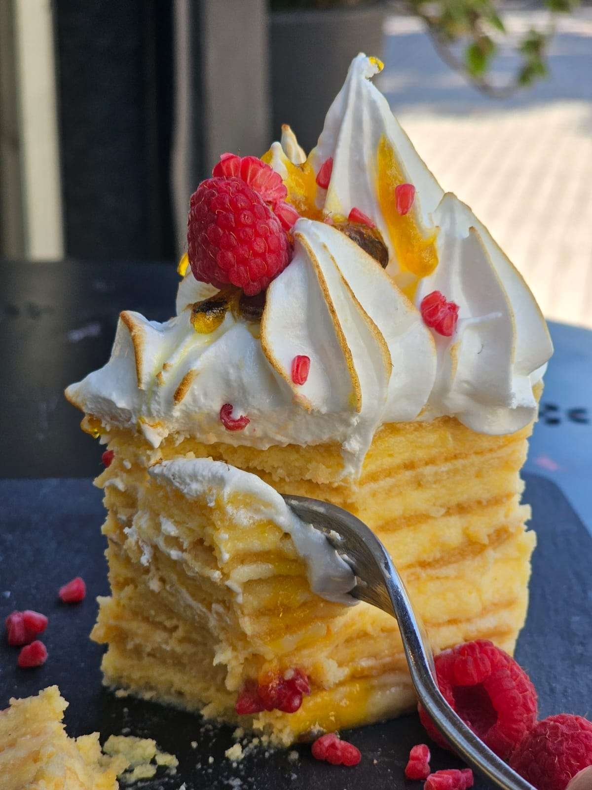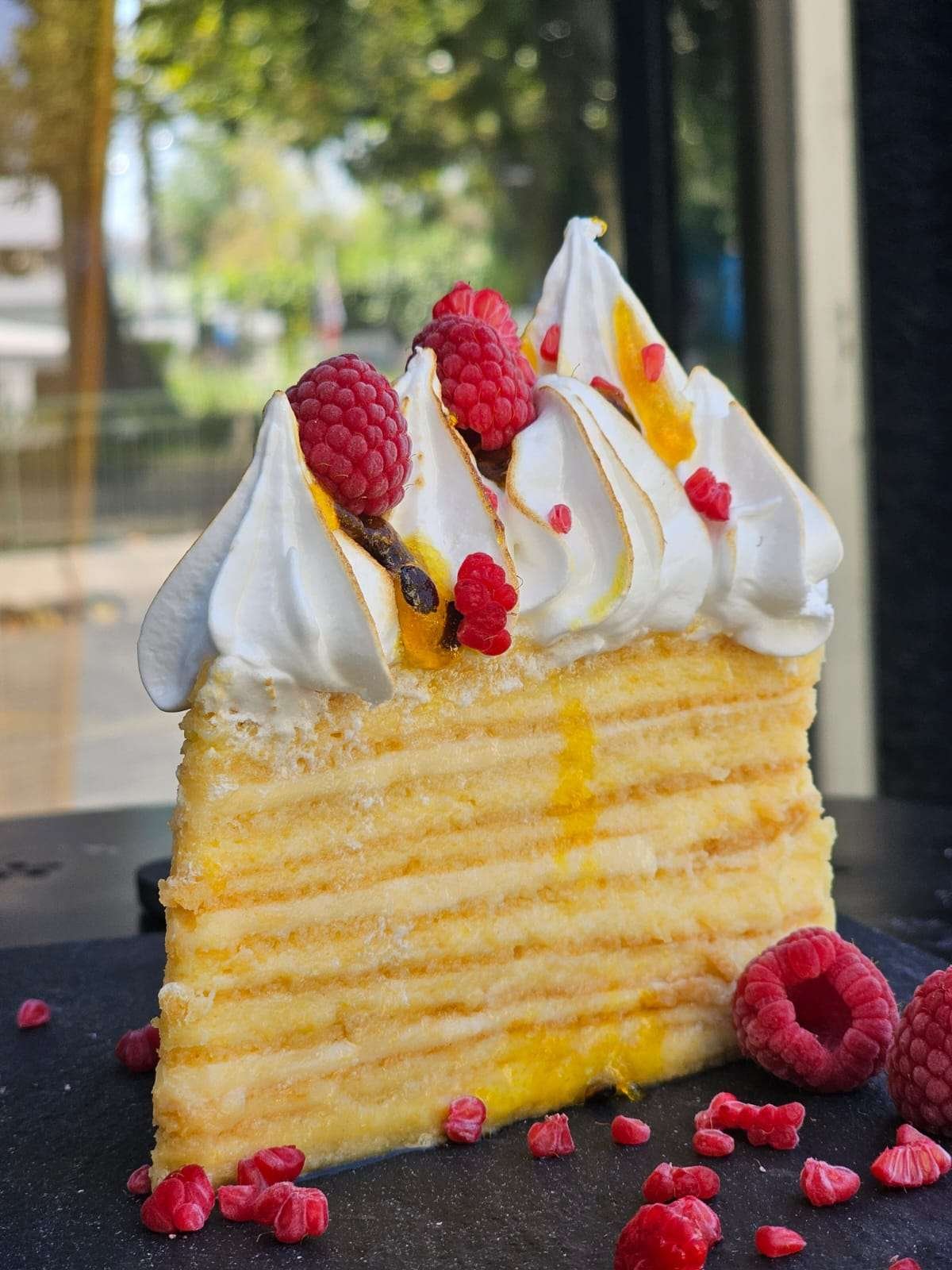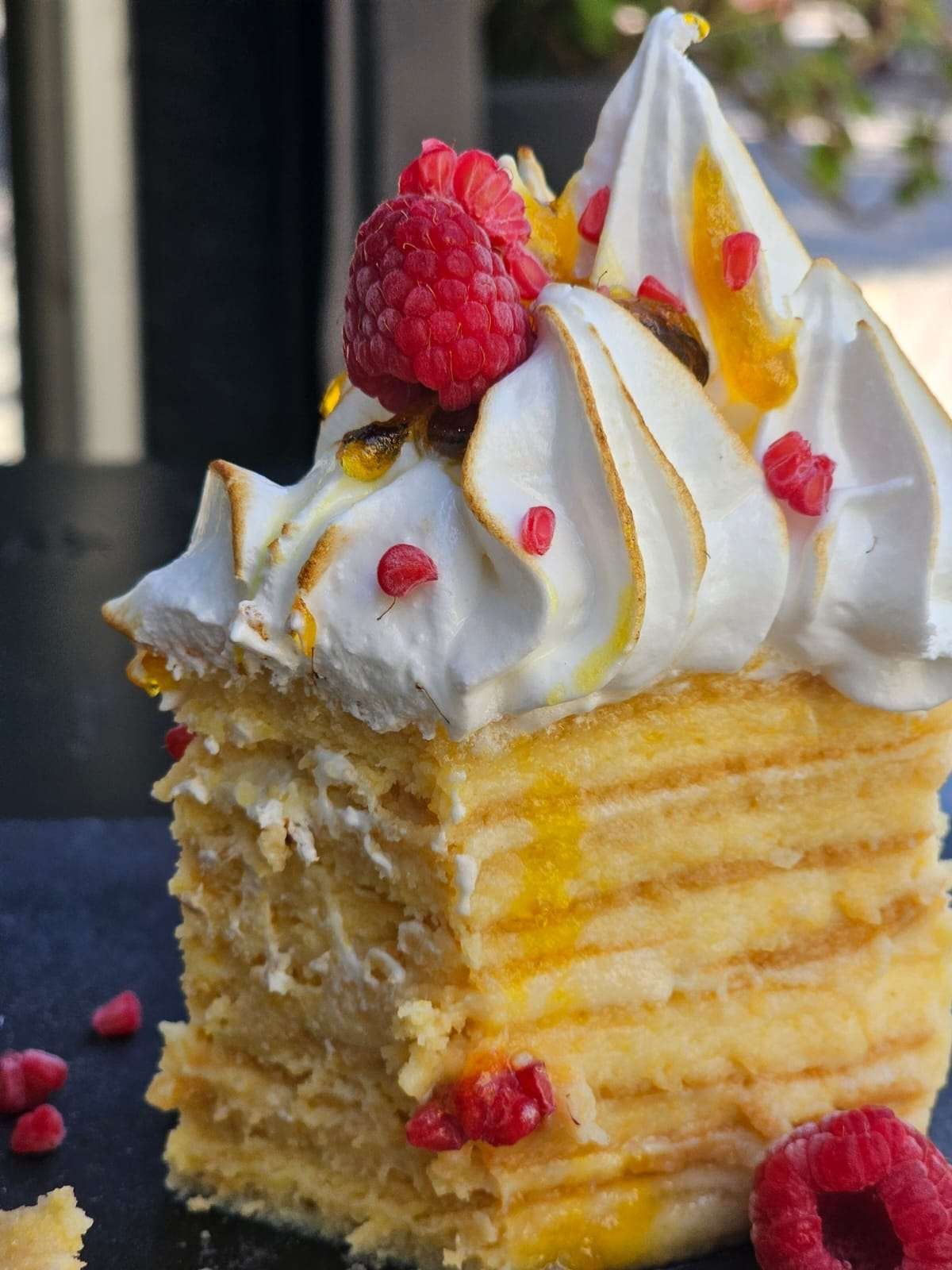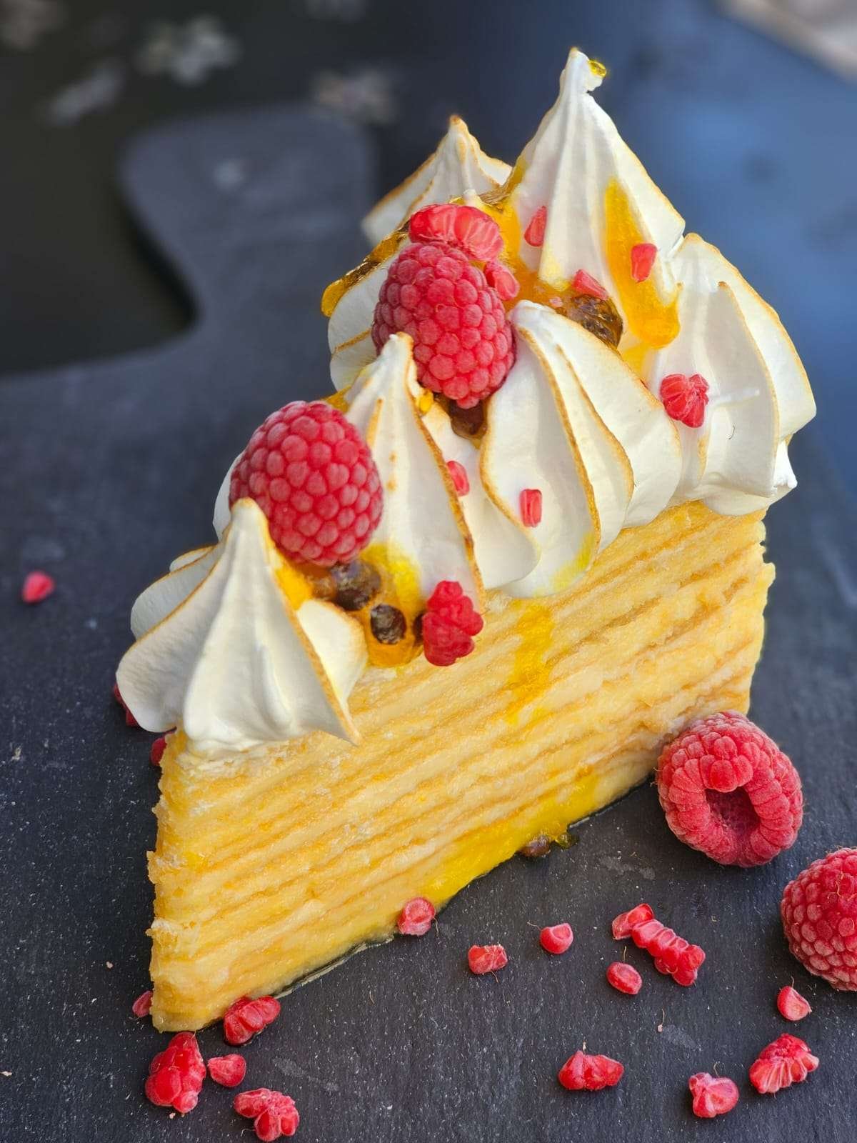 Panqueque de vainilla relleno con un suave mousse de maracuyá y crema de pie de maracuyá.