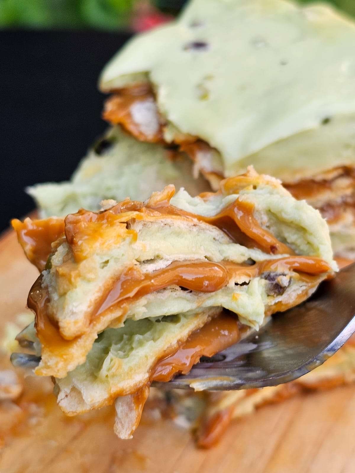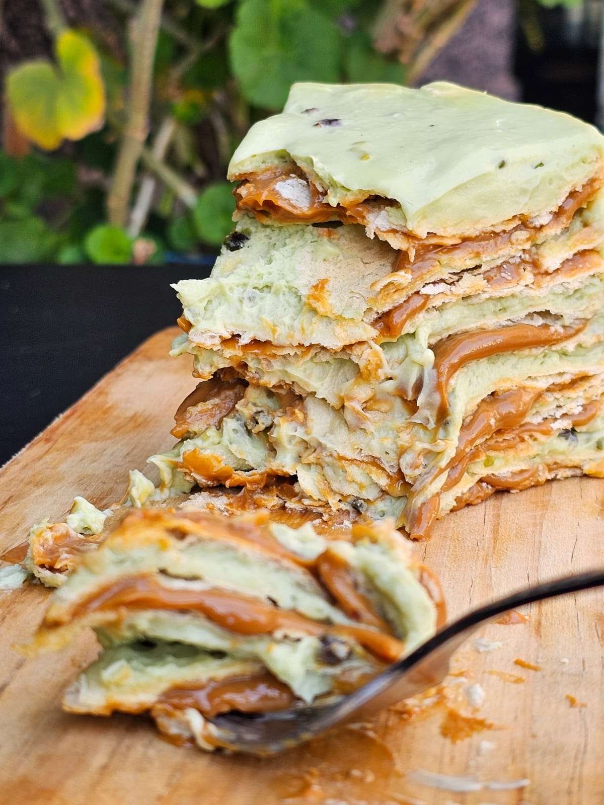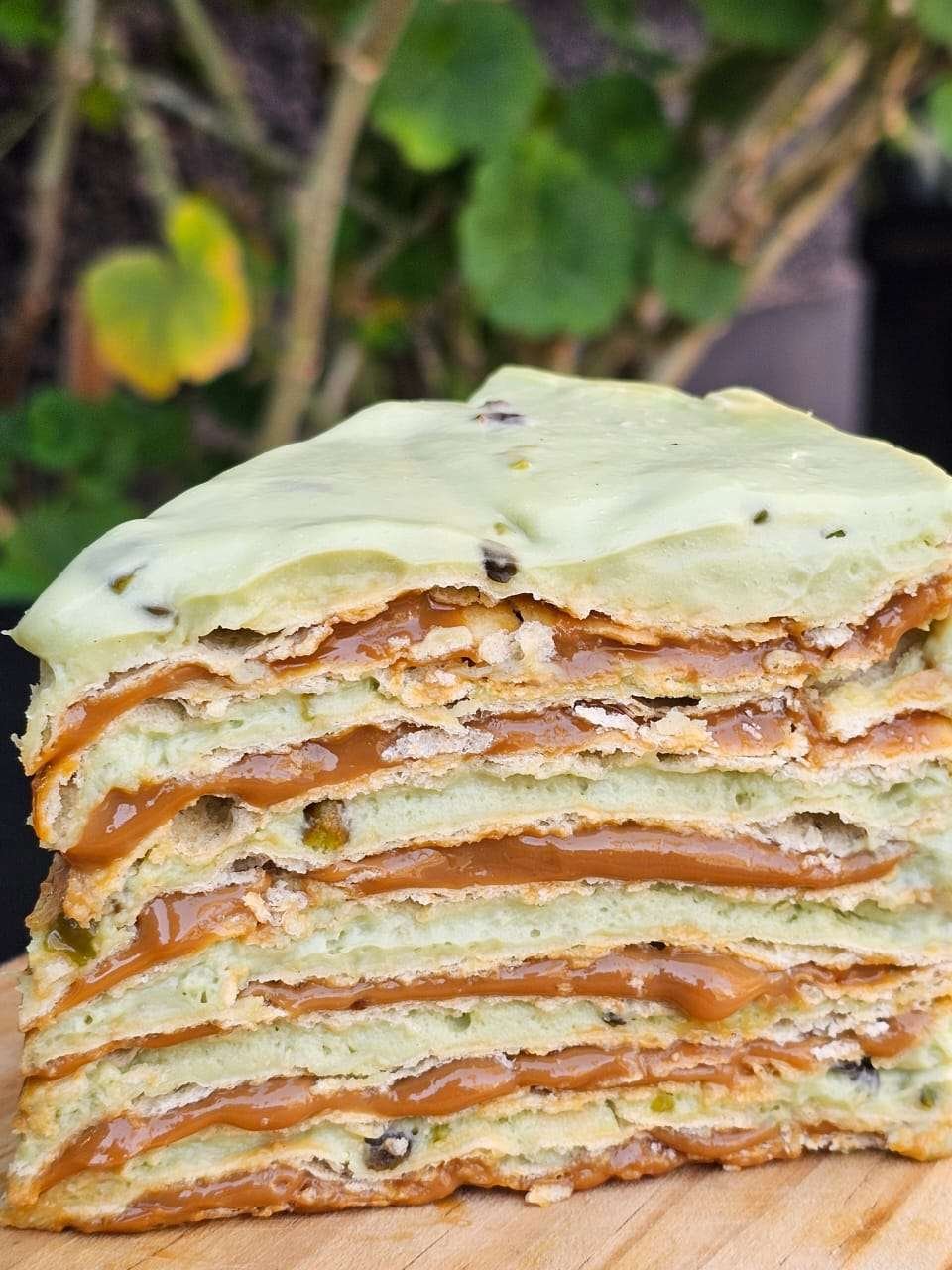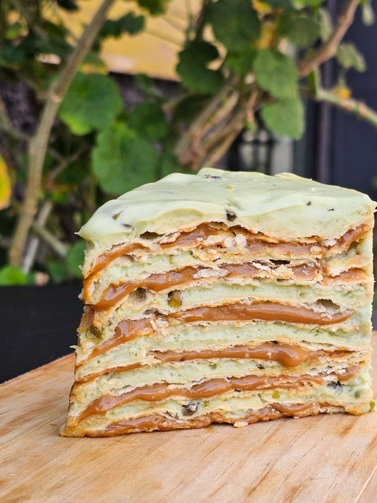 Milhojas, manjar y crema de Pistacho. Cubierta de crema de Pistacho.