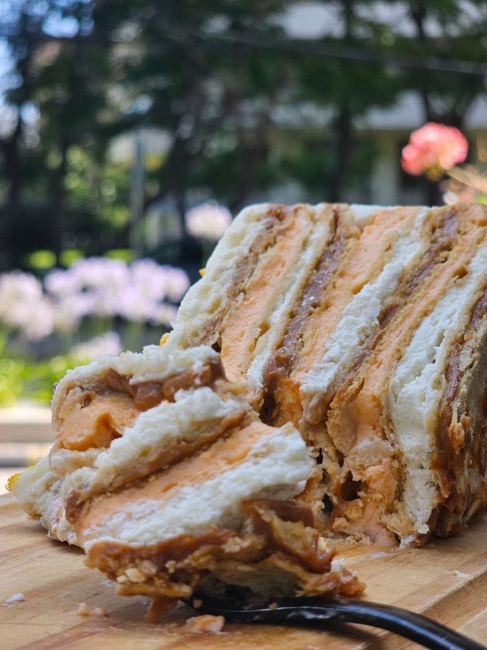 Milhojas, manjar, crema de plátano y crema de naranja.